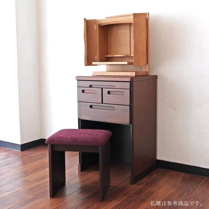 本体下にはスツールを収める専用スペースを備えており、使わないときにはスツールを収納することで、収まりが良く見た目もすっきり。お部屋全体が整った印象になります。省スペース設計のため、限られた空間でも効率的にお使いいただけるのが魅力です。来客時や作業時にはサッと取り出せ、使用後はスマートにしまえるため、片付けの手間もかかりません。インテリアとしてもスタイリッシュに見せられる、機能性とデザイン性を兼ね備えた便利なアイテムです。また、仏壇周りの小物を収納するのに十分な容量を備えた引き出し付きで、数珠や線香、ローソクなどをすっきり整理できます。本体幅は55cmとコンパクトで場所を取らず、国産製造ならではのしっかりとした作りで長くご愛用いただけます。